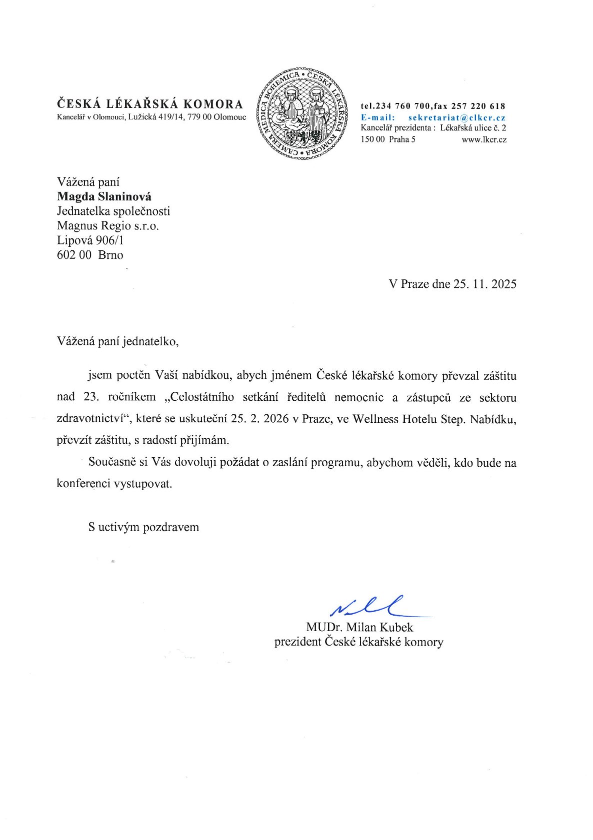 Dne 25. února 2026 se v Praze, v hotelu STEP, uskuteční 23. ročník kulatého stolu na téma Zdravotnictví, který se zaměří na aktuální investice do nemocnic a výhledy pro rok 2026 a dále. Diskutovat se bude také o úsporách energií ve zdravotnických zařízeních, standardech UDI, rozšiřování a rekonstrukcích nemocnic – s příklady z praxe, a o bezpečnosti v nemocnicích, tedy o tom, jaké jsou minimální standardy a co už představuje vyhovující stav. Akce bude tradičně příležitostí k výměně zkušeností, prezentaci nejnovějších trendů a sdílení dobré praxe z oblasti řízení a rozvoje zdravotnických zařízení. Těšíme se na setkání a inspirativní diskuzi!