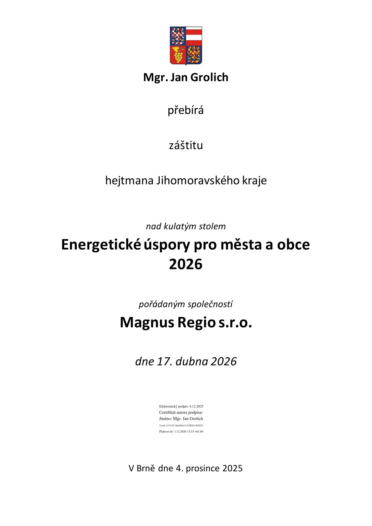 Dovolujeme si Vás pozvat na setkání u kulatého stolu na téma Energetické úspory pro města a obce, které se uskuteční 17. dubna 2026 v hotelu Avanti v Brně. Téma letošního setkání se zaměří na budování nových obnovitelných zdrojů energie, vývoj komunitní energetiky a sdílení elektřiny mezi městy, obcemi a firmami. Diskutovat budeme také o možnostech využití úložišť energie, snižování energetické náročnosti veřejných budov prostřednictvím EPC projektů a zajištění bezpečnosti a dlouhodobé udržitelnosti fotovoltaických elektráren (FVE) – včetně požární a kybernetické bezpečnosti. Ke kulatému stolu zasednou zástupci měst, obcí, krajů, Ministerstva životního prostředí, Státního fondu životního prostředí, energetických firem a dalších odborných institucí.